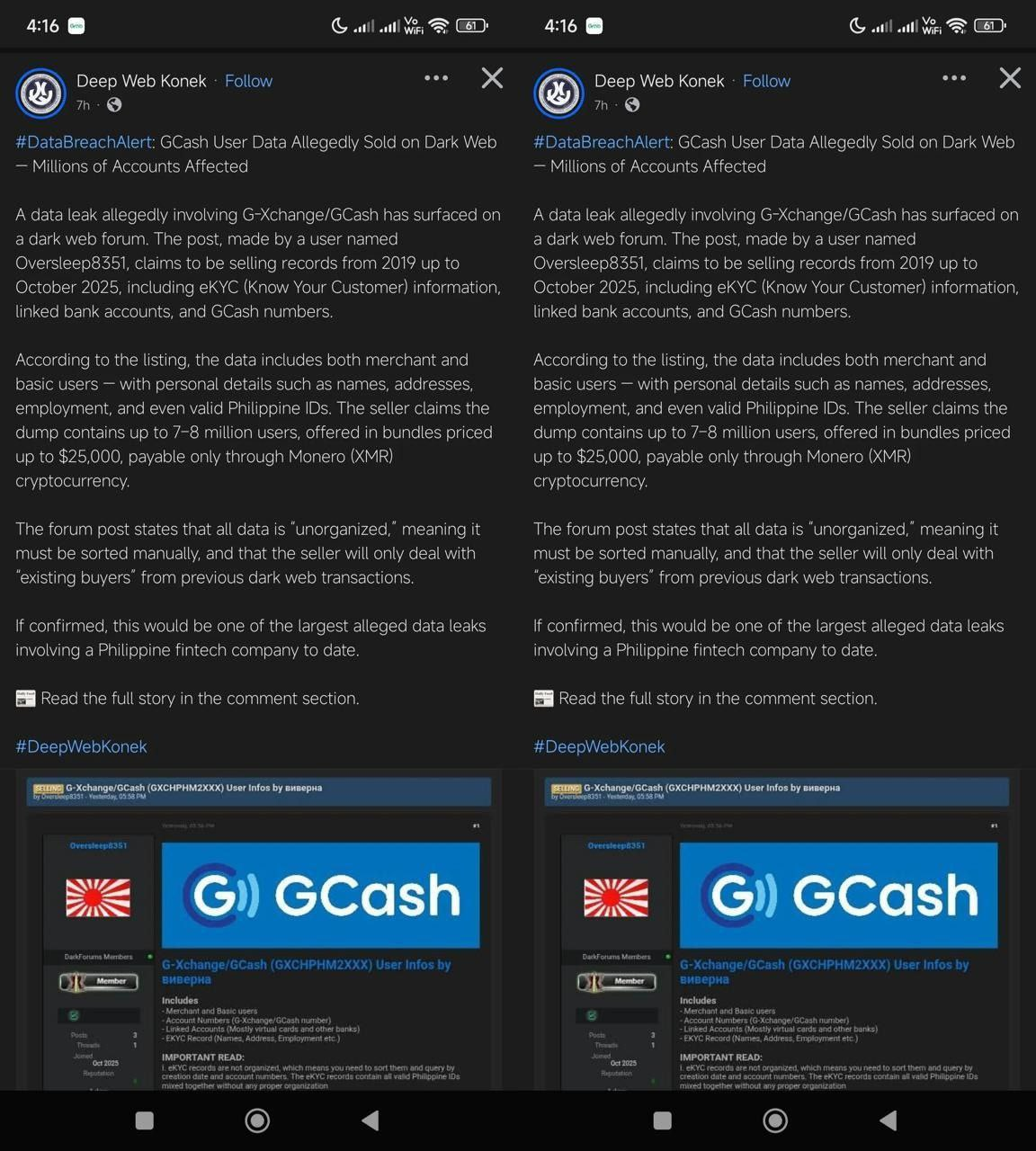 #菲律宾新闻:最大电子钱包GCash疑似发生大规模数据外泄事件!一份疑似来自其运营公司G-Xchange Inc.的数据库,近日出现在暗网论坛上公开出售,声称涵盖2019年至2025年10月期间多达700万至800万名用户的资料。